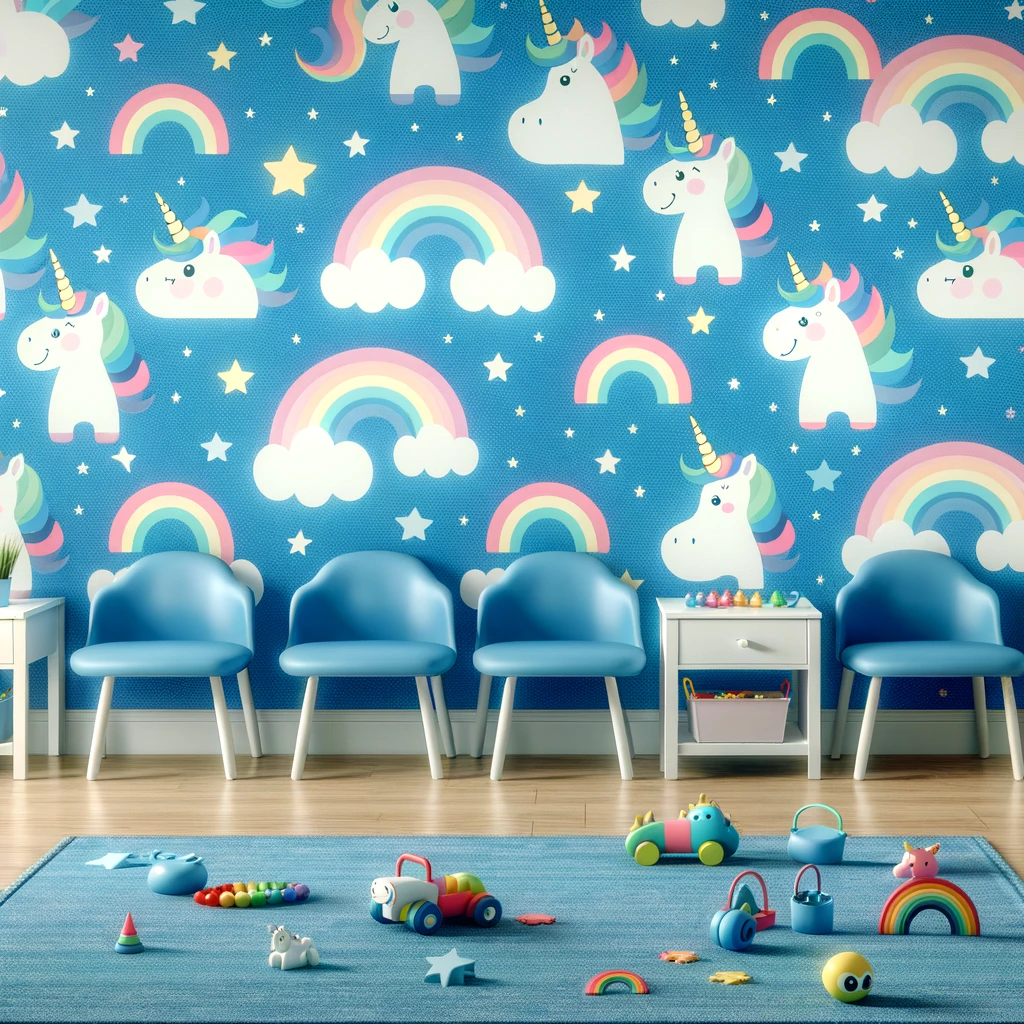 This vibrant wallpaper features a playful pattern of unicorns with multicolored manes and tails, interspersed with rainbows and geometric shapes against a bright blue background. It's perfectly suited for a children's room, nursery, or play area, where the energy and joy of the pattern can stimulate a child's imagination and creativity.