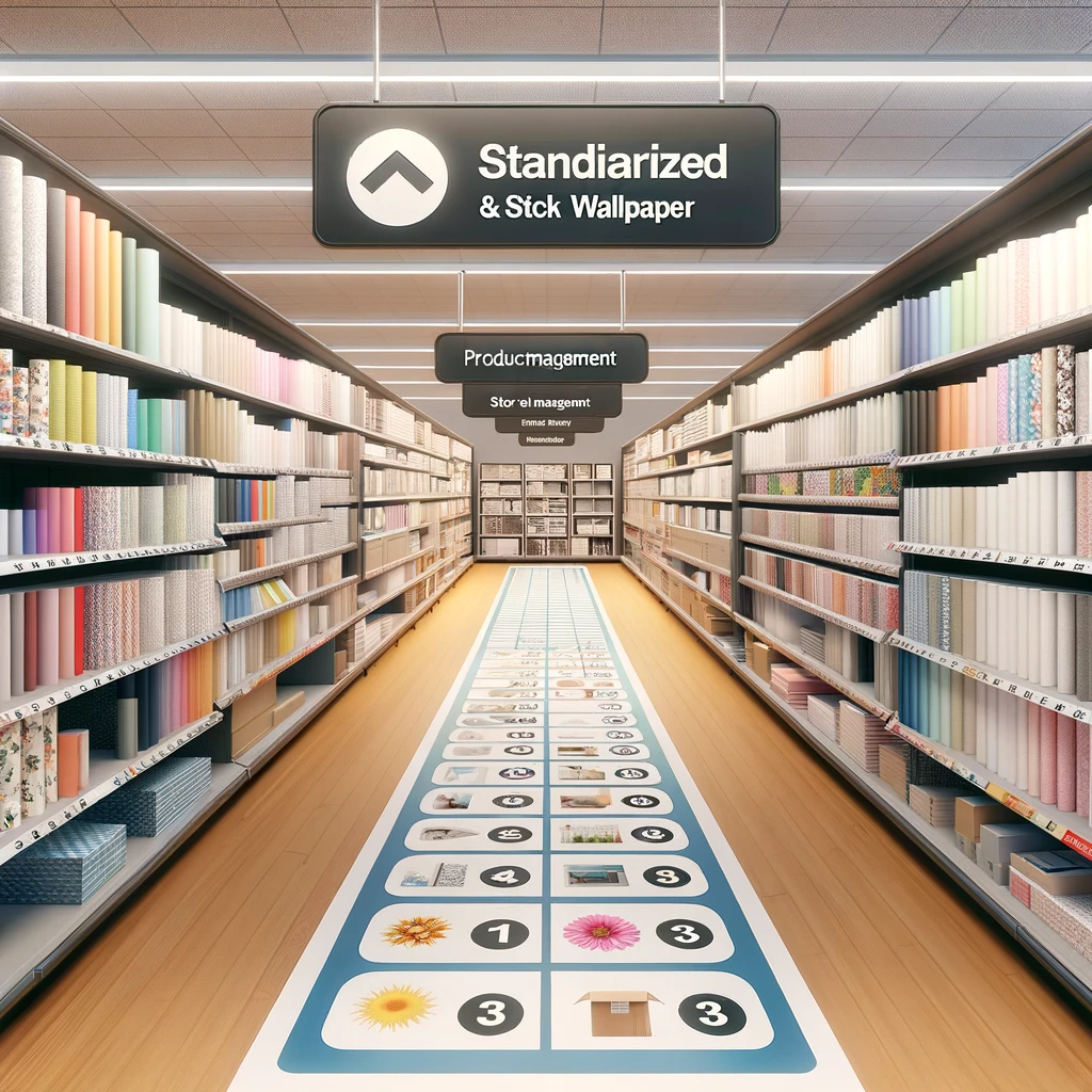Designing a standardized store layout and signage system helps customers navigate through different sections easily, including the peel and stick wallpaper section, enhancing the shopping experience.