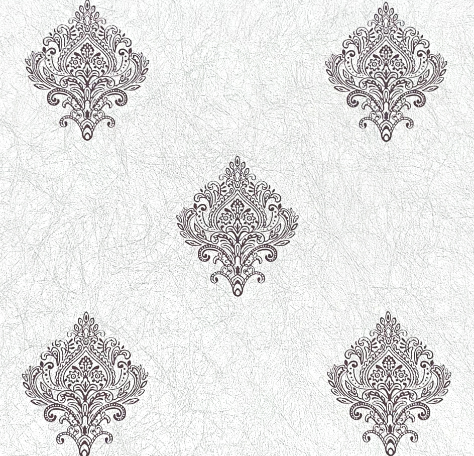 This wallpaper features a sophisticated damask pattern with an intricate design. The use of monochromatic colors suggests a timeless elegance, making it suitable for areas where a classic and upscale atmosphere is desired, such as formal dining rooms, living rooms, or traditional bedrooms.