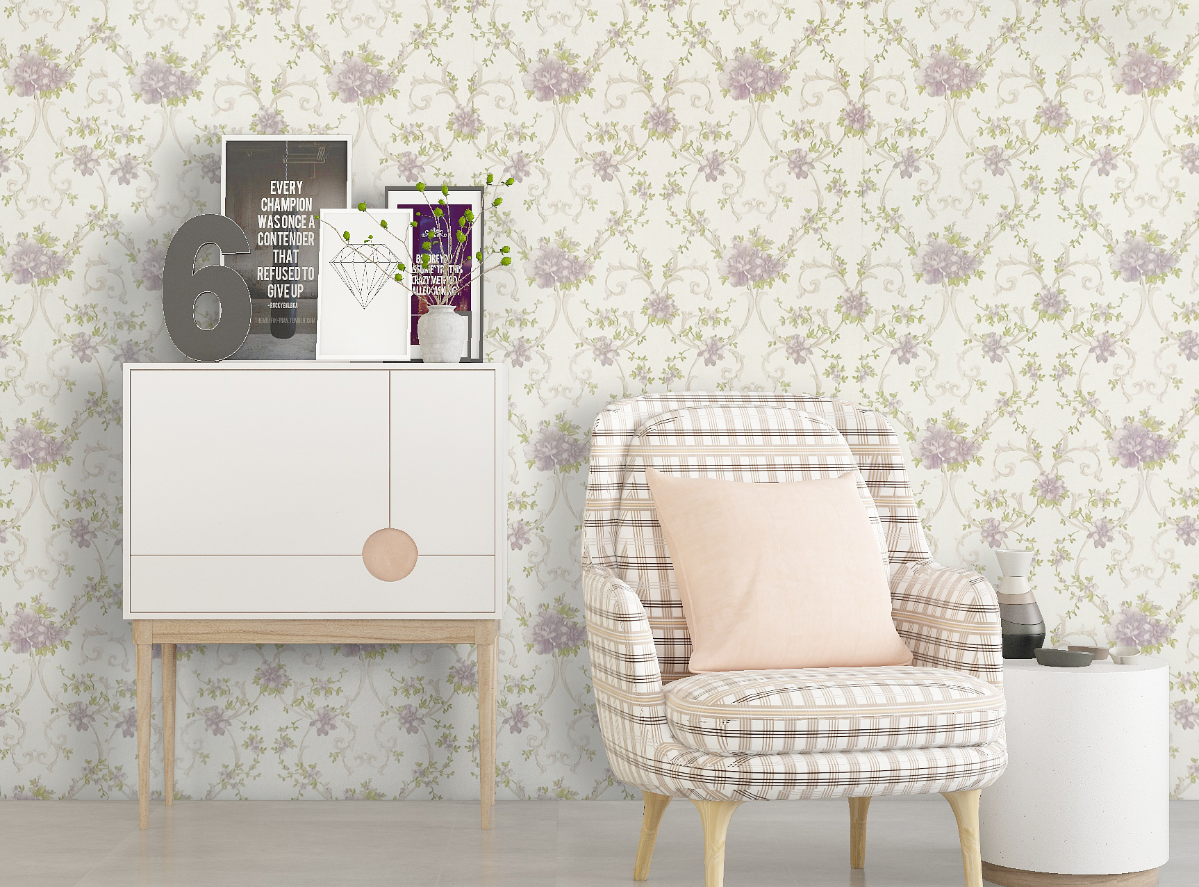 Pairing this wallpaper with shabby chic or French country furniture would complement its romantic vibe. Furniture in white-washed woods and light fabrics, as well as accessories like crystal vases and pastel-colored cushions, would work harmoniously with this design.