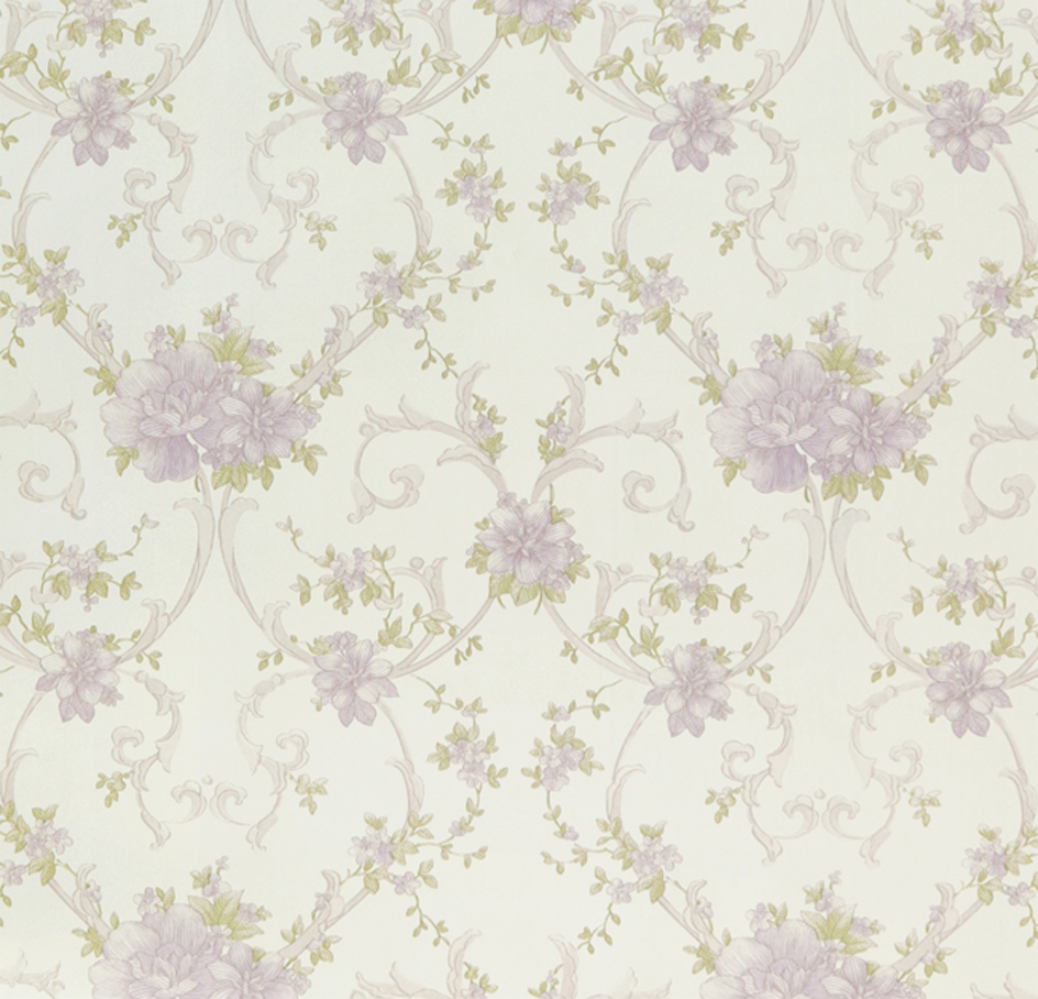 This wallpaper displays a soft and inviting floral pattern, rendered in gentle lilac and green hues on a cream background, creating a fresh and serene atmosphere. The design is delicate and romantic, suggesting its suitability for intimate spaces such as bedrooms, private bathrooms, or a quaint bed-and-breakfast guest room.