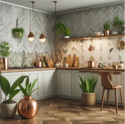 Moreover, self-adhesive wallpaper complements other elements in the kitchen, from copper pots to green plants, enhancing the room's overall aesthetic. This harmony between functionality and style creates a warm, inviting atmosphere that makes every meal preparation a pleasure.