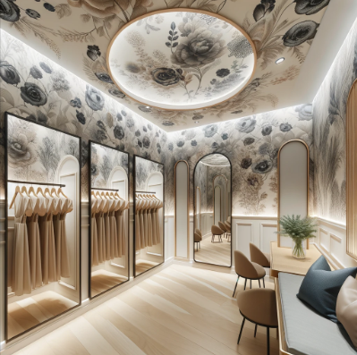 Self-adhesive wallpaper adds a sophisticated touch to the dressing room, instantly elevating its ambiance. The warm, inviting atmosphere created by these designs encourages customers to relax and enjoy their shopping experience, reflecting positively on the boutique's brand.