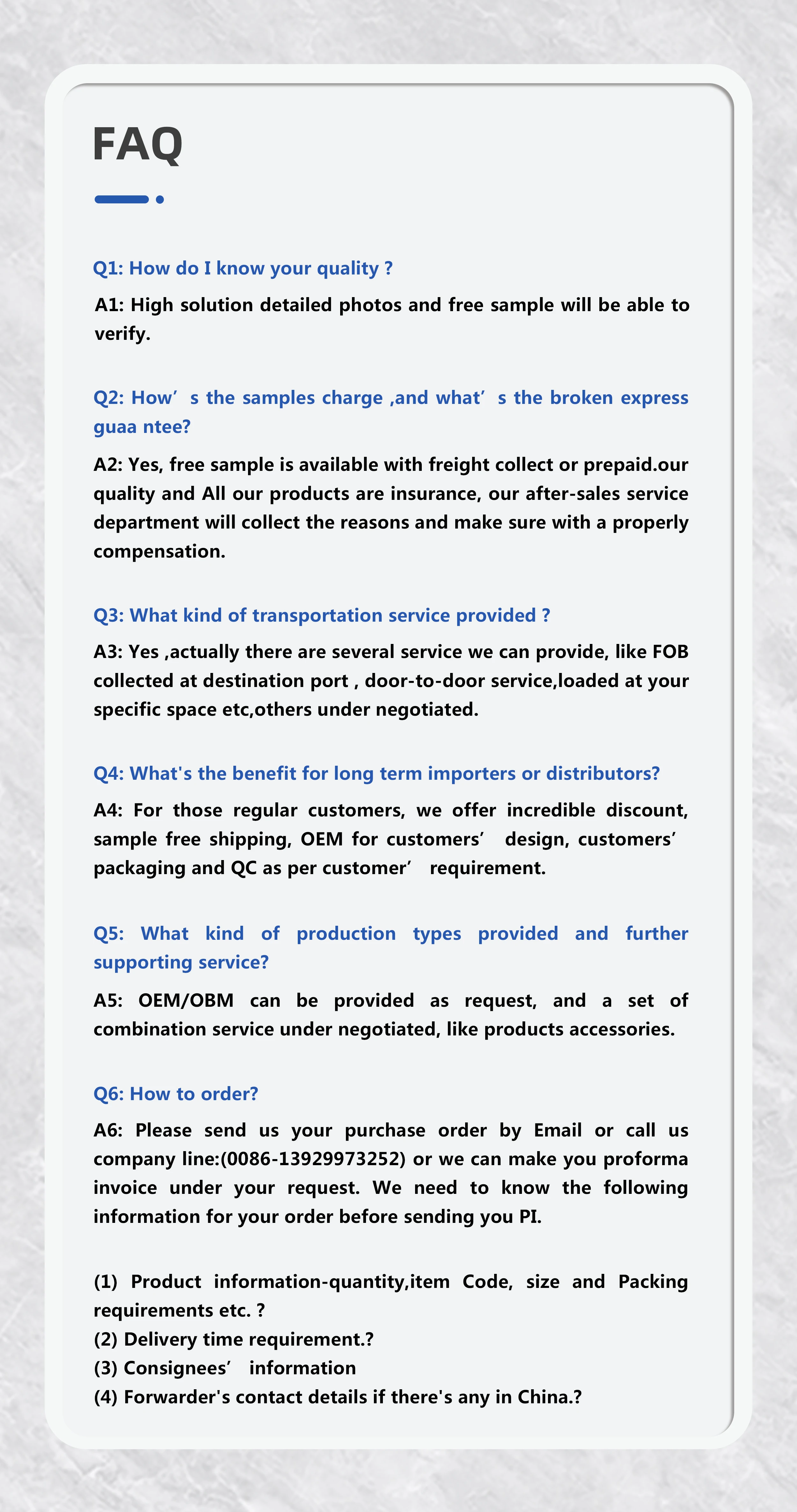 6. The best after-sales service! If there are any errors in our products and services, customers can contact to us, and we will try our best to support you!